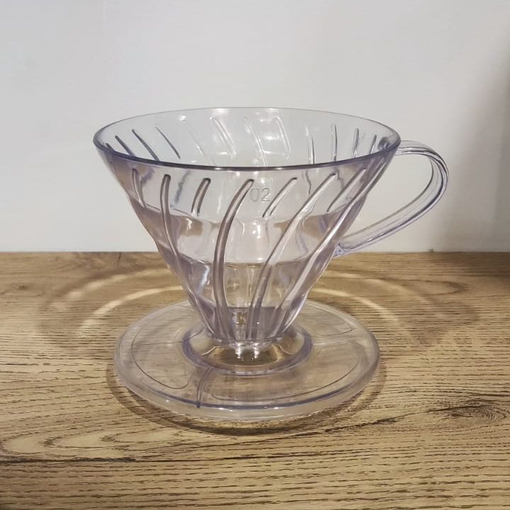 Metodo de filtrado v60 tamaño 02, para preparar entre 1 y 5 tazas de cafe, en acrilico de alta resistencia para soportar la temperatura y las caidas.